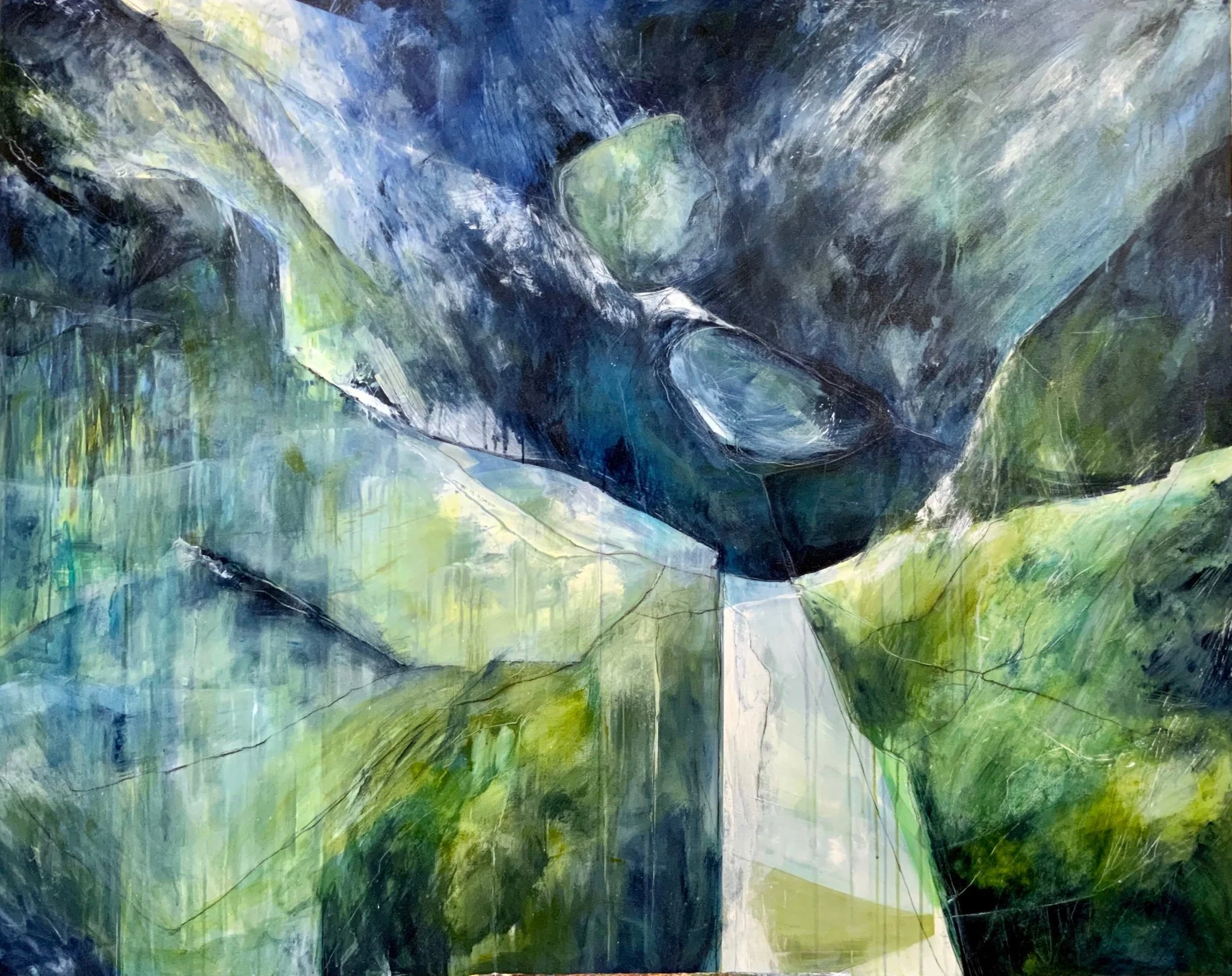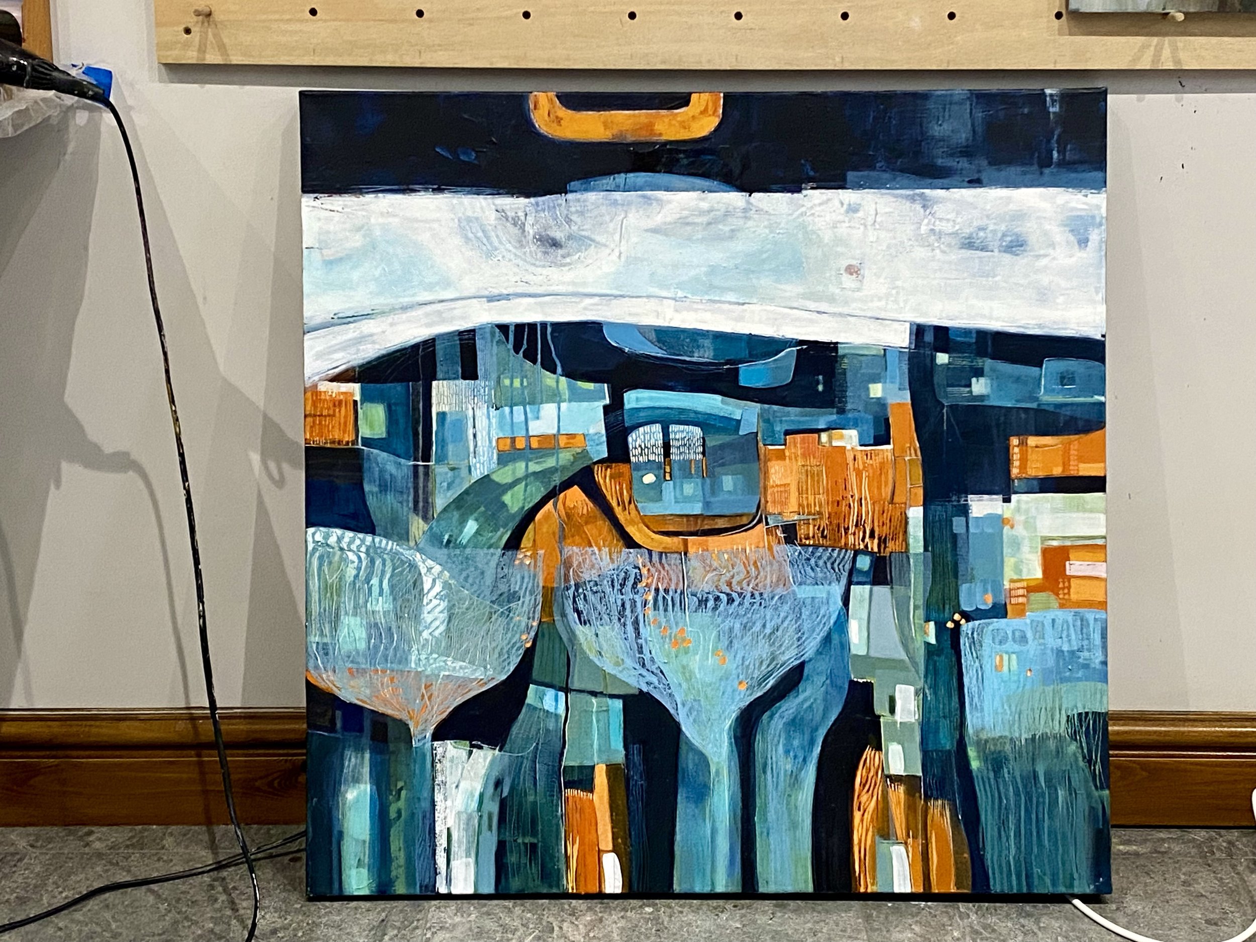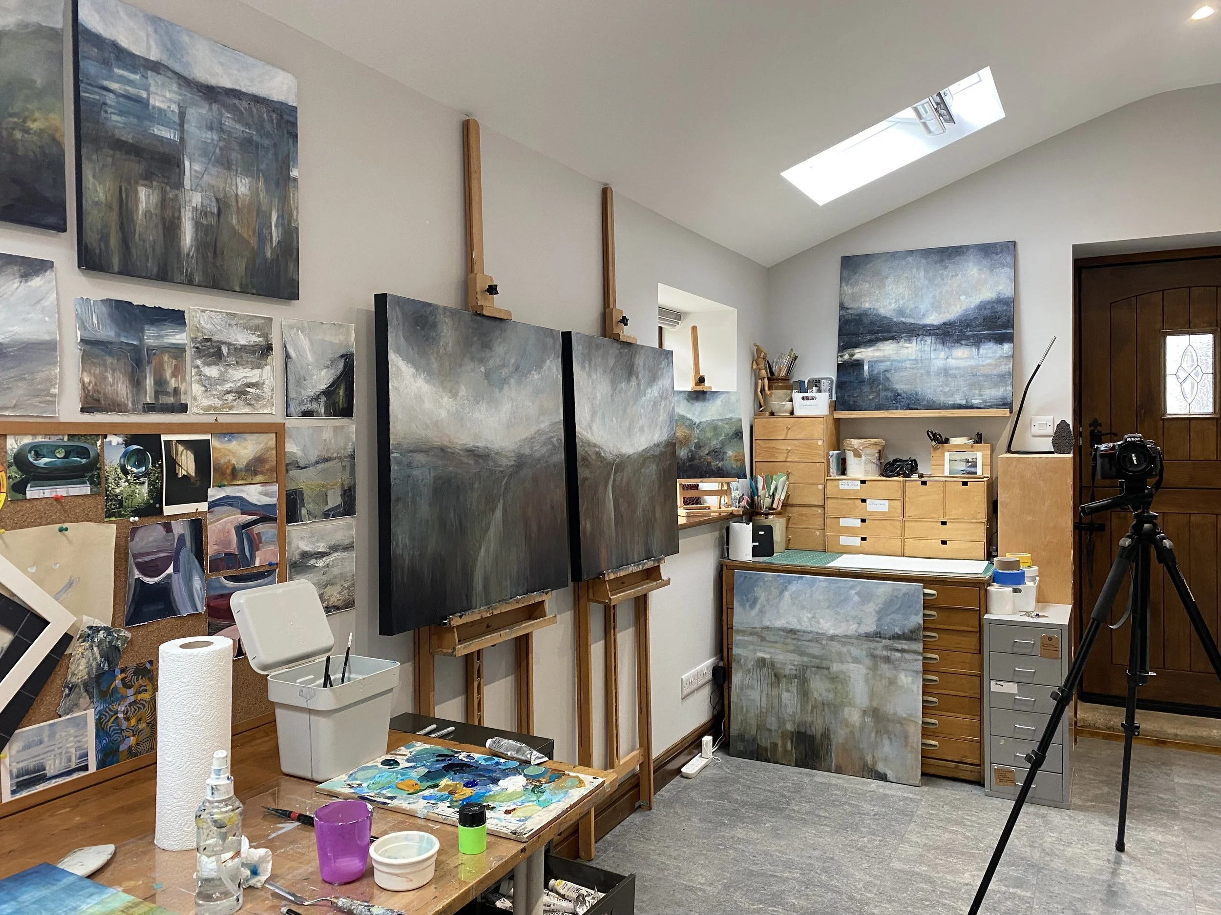 Ideas tend to come when I’m out walking; all the time, I’m noticing shapes and contrasts, atmosphere, layers and textures. Then back in the studio, I’ll start to play around with colour palettes, thumbnail sketches, notes, studies etc…until something grabs me that is worth developing.