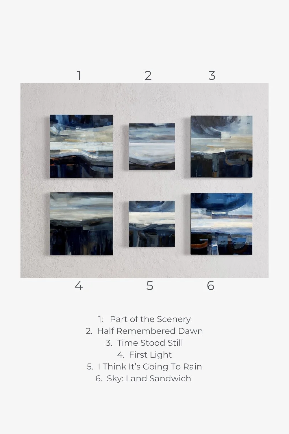 The 40.5 cm x 40.5 cm paintings (Part of the Scenery SOLD, Time Stood Still, First Light and Sky: Land Sandwich) are £575 including UK delivery (please contact me for overseas shipping)