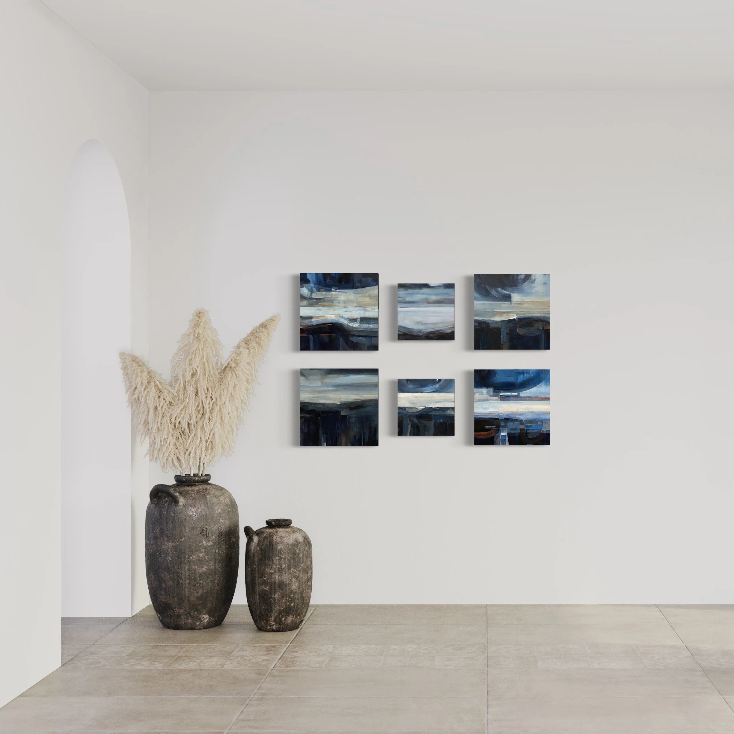Paintings numbered 1, 3, 4 and 6 are 40.5 cm x 40.5 cm and paintings 2 and 5 are 35 cm x 35 cm.