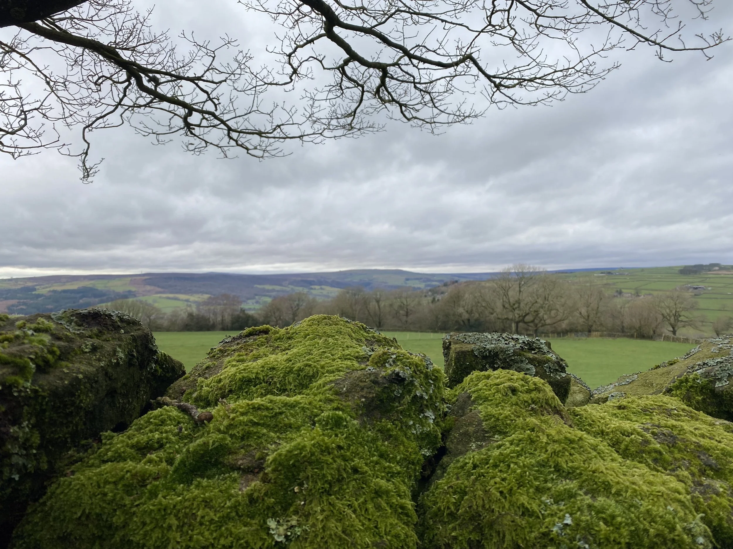 I love this moss covered wall, framing the view out over the landscape, near where I live.