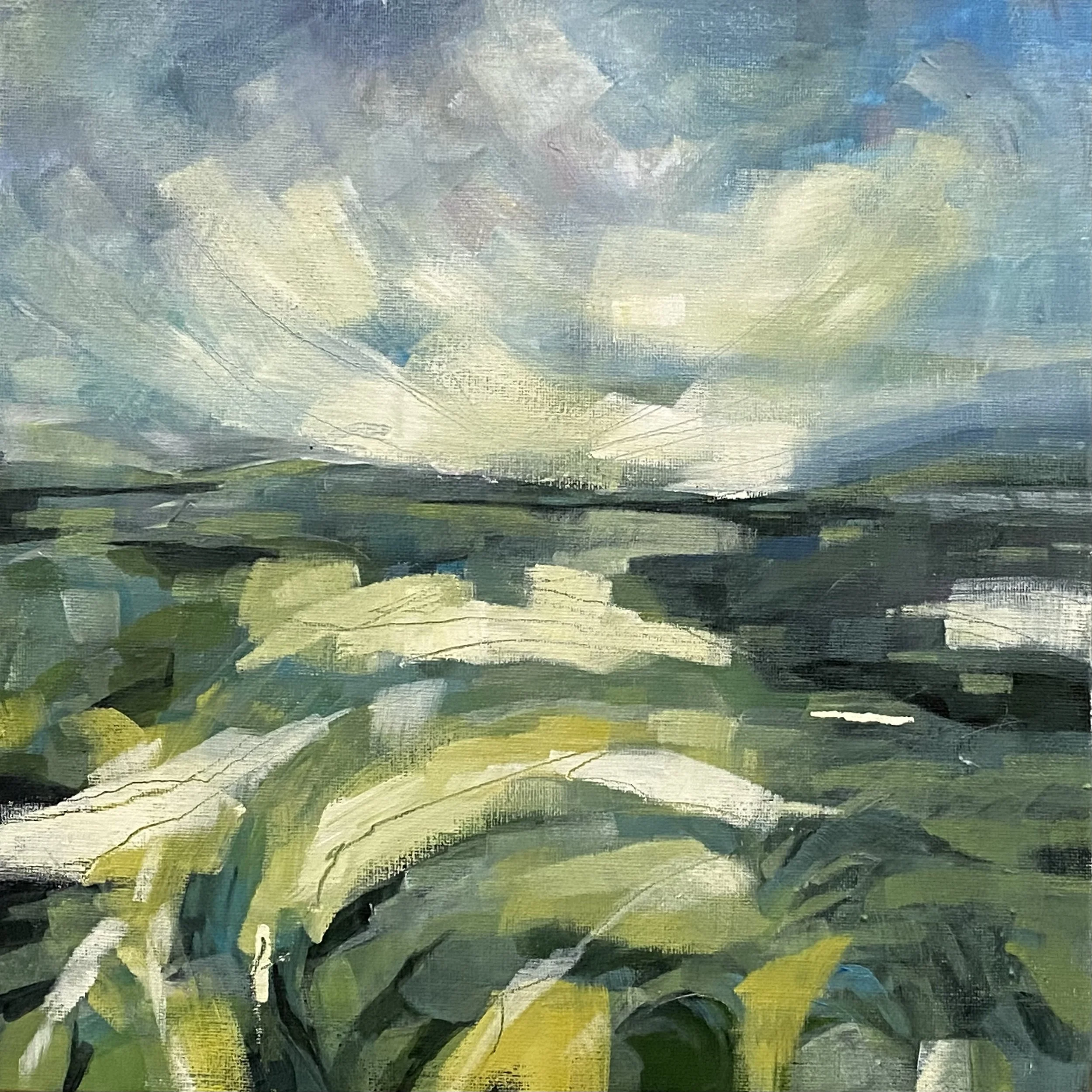 …it comes from high fields close by, where I was listening to the Curlews, and wondering where they will nest. This is also a daily practice/ jumping off point painting, this time on a canvas panel.