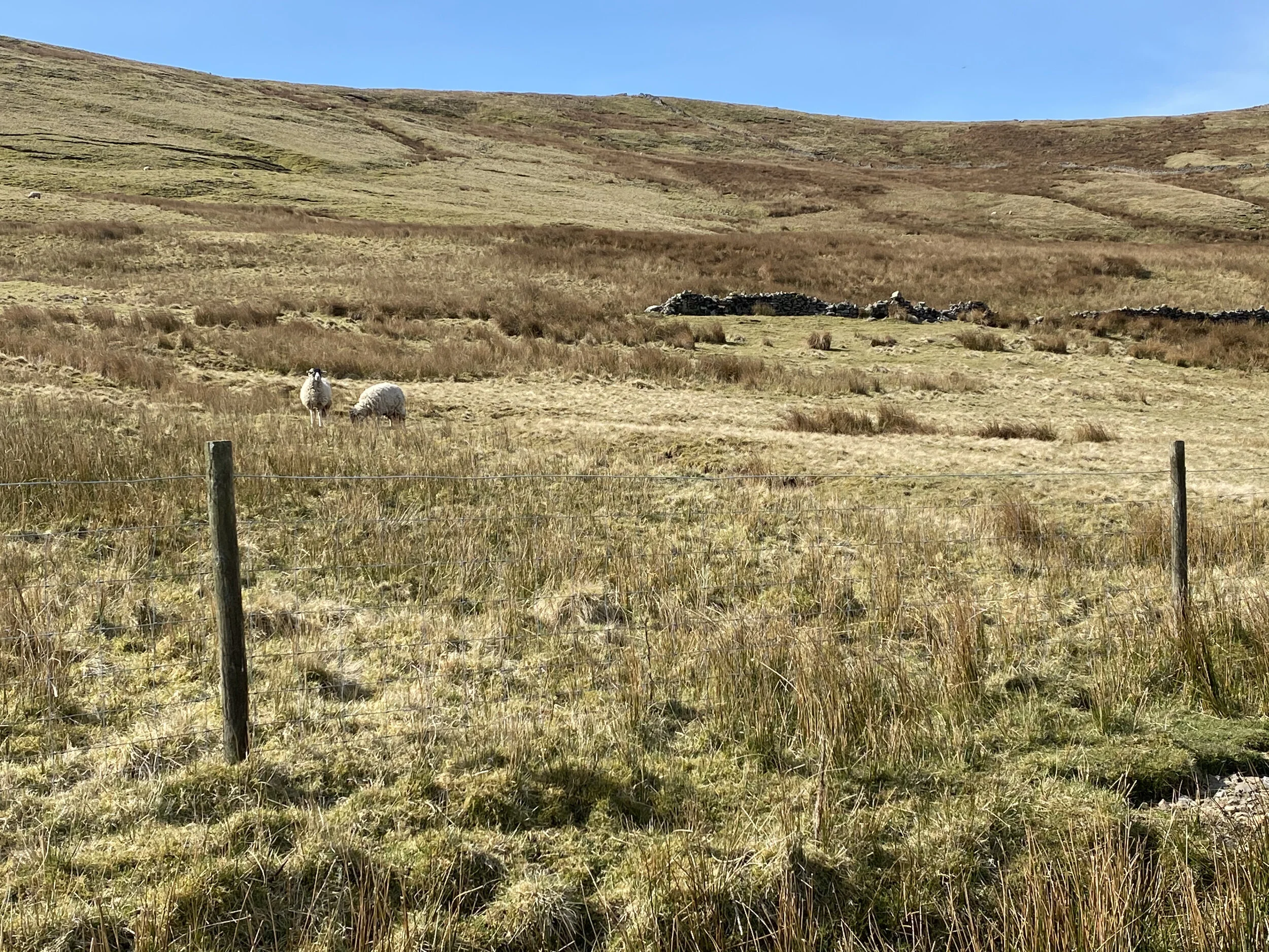 Typical Dales scenery: scrubby fells, dry stone walls, becks( not a famous footballer, but small streams) and sheep