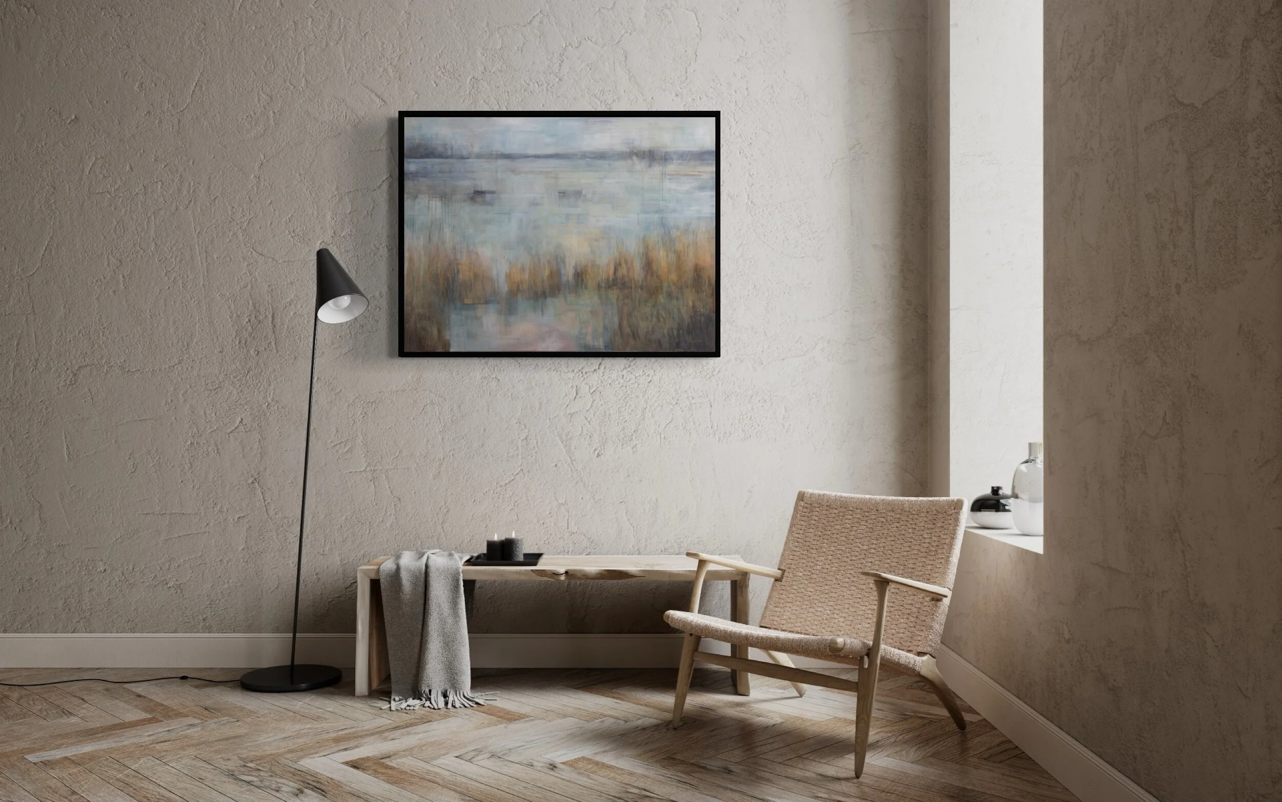 I’ve been trying out a new App for artists to visualise their work in room settings; it’s ’Smartist’ App. So far I’m liking it very much; its so simple to use and the sets are nice. I’ve never felt ready to subscribe to one of these, but the free version of this one really is pretty good, although the downside of course is that there are only a few room sets. I quite like the example below as it has a soft light and sense of texture which really helps I think…