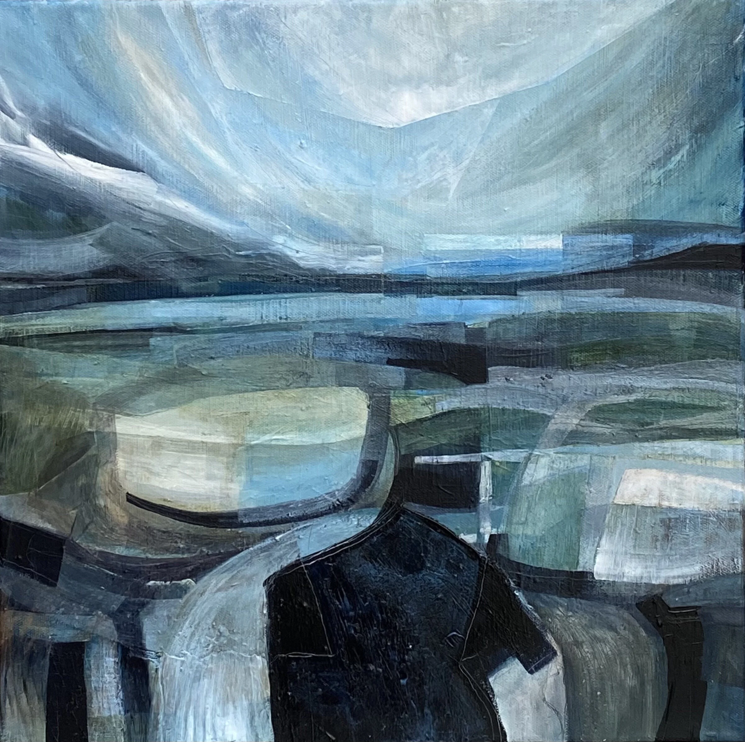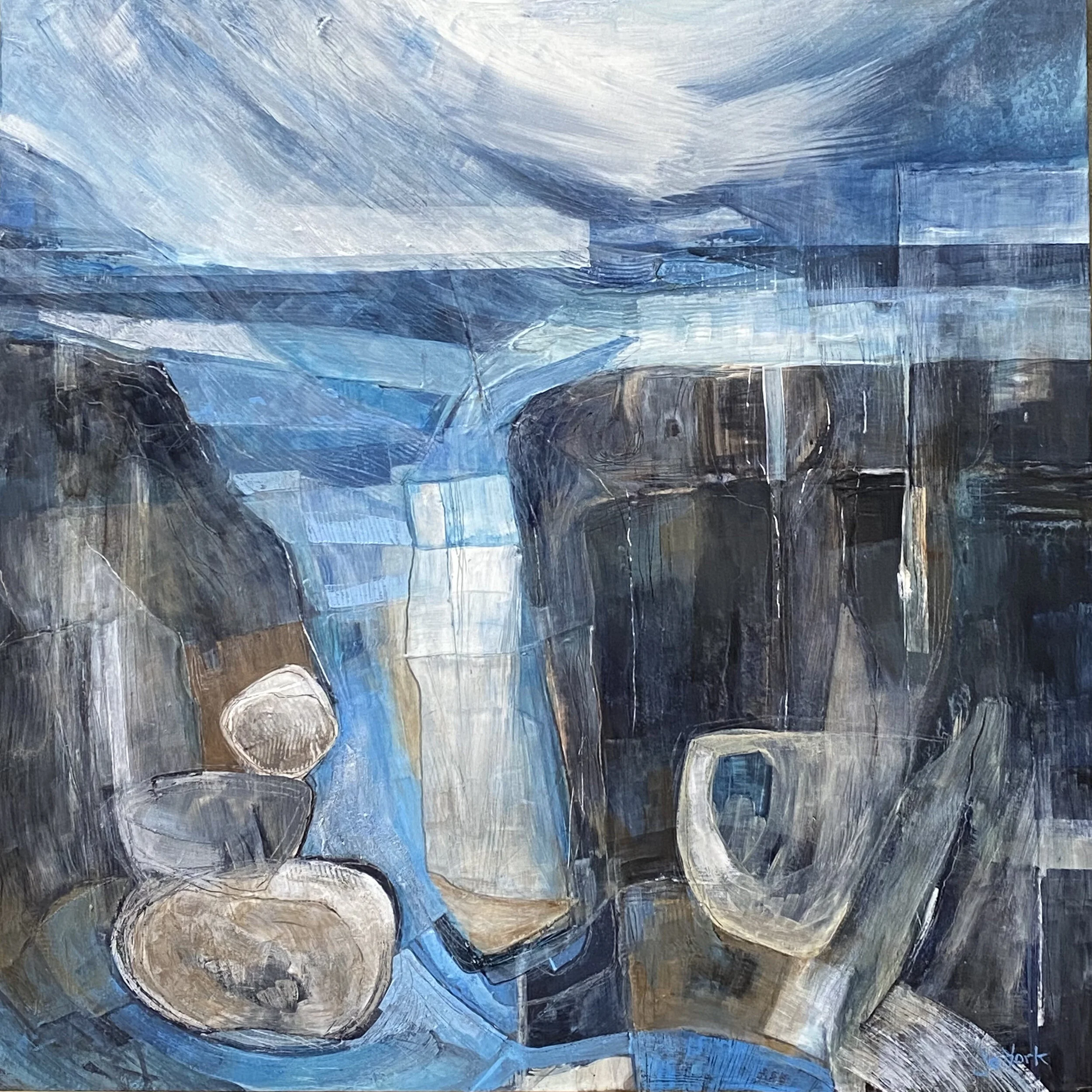 Following on from Rhythm of Rocks and Water, but in the same little series, I’ve recently finished a 46 cm cradled panel called Blue Zawn. Walking along the Atlantic Coast of Cornwall, you often come across deep and narrow inlets with steep rocky cliffs…in the South West of the UK they’re often called Zawns, although in the Cornish Language the word relates more to a fissure or even a cave in the rocks. Either way, I love both the landscape and the name, hence the name of this piece.