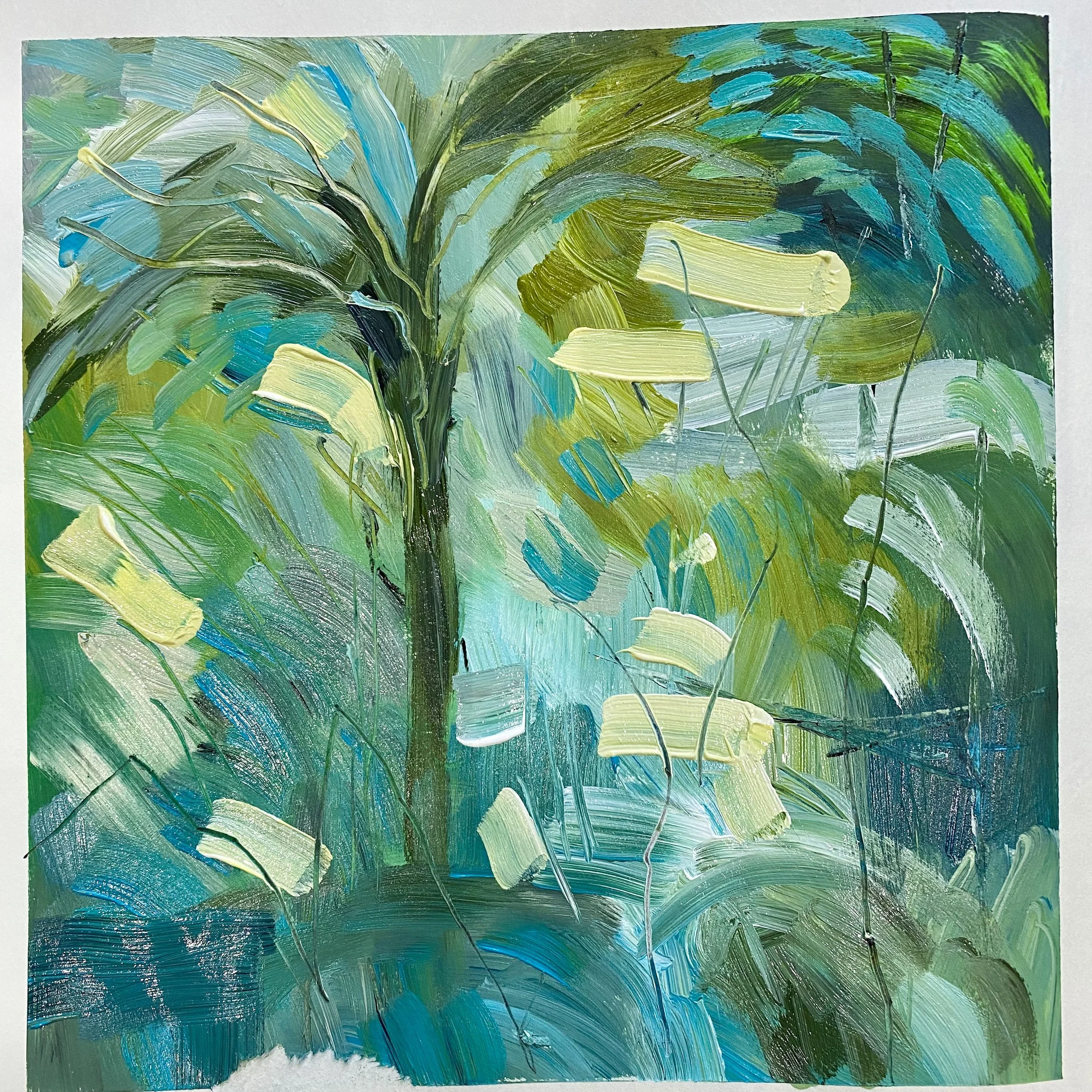 For me, it’s really helpful working on a group of paintings at any one time…it just makes sense; you can swap between them when something needs to dry or you need more time to figure out the next steps, and very often there is at least a linked colour palette, which means you can mix up specific versions of colours in a reasonable quantity if you’re going to need over and again. This little series is built up as always with me, in many layers, but the approach this time is slightly different, with more opaque paint and a deliberate focus on expressive mark making, and hopefully a sense of movement.