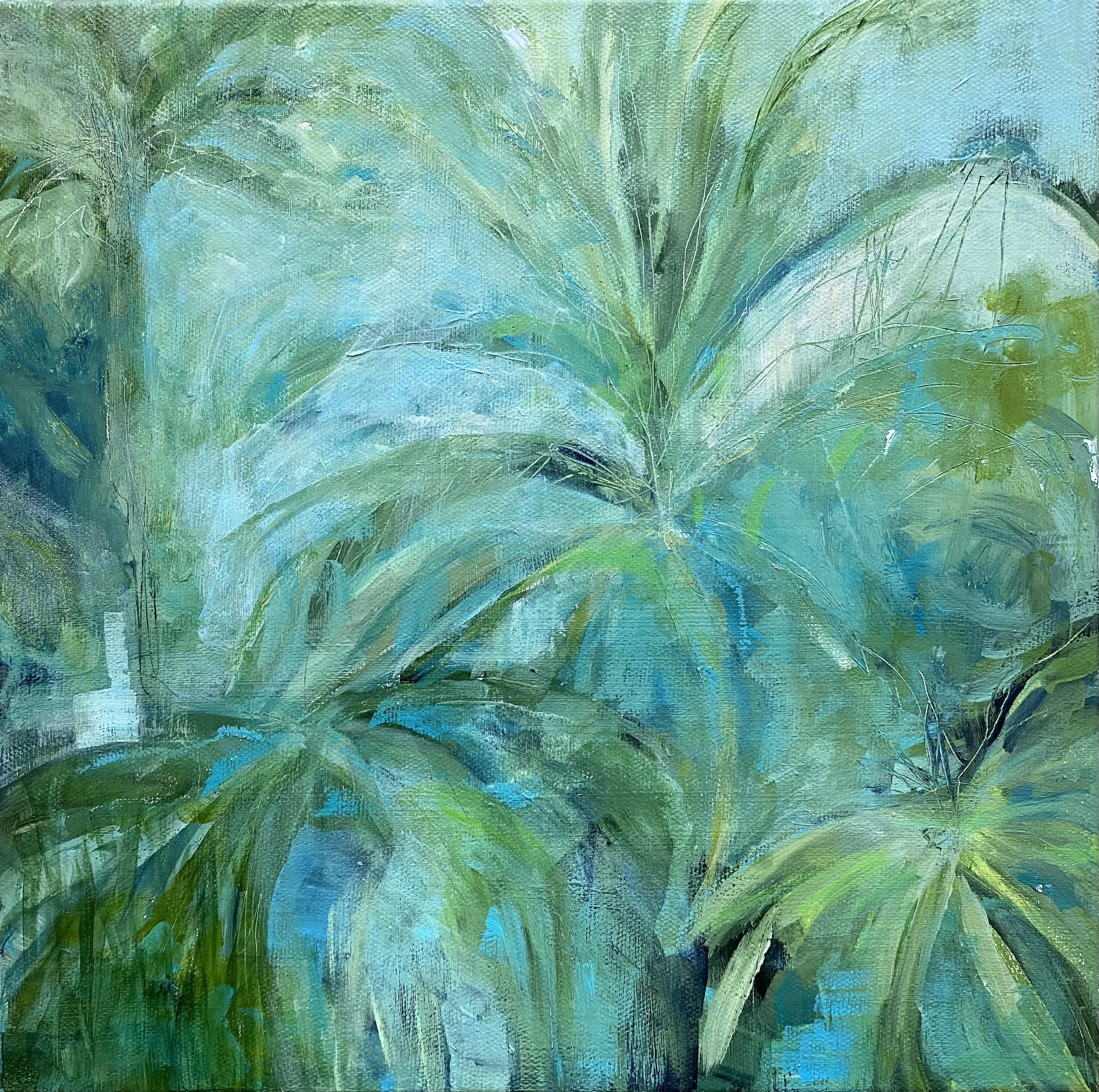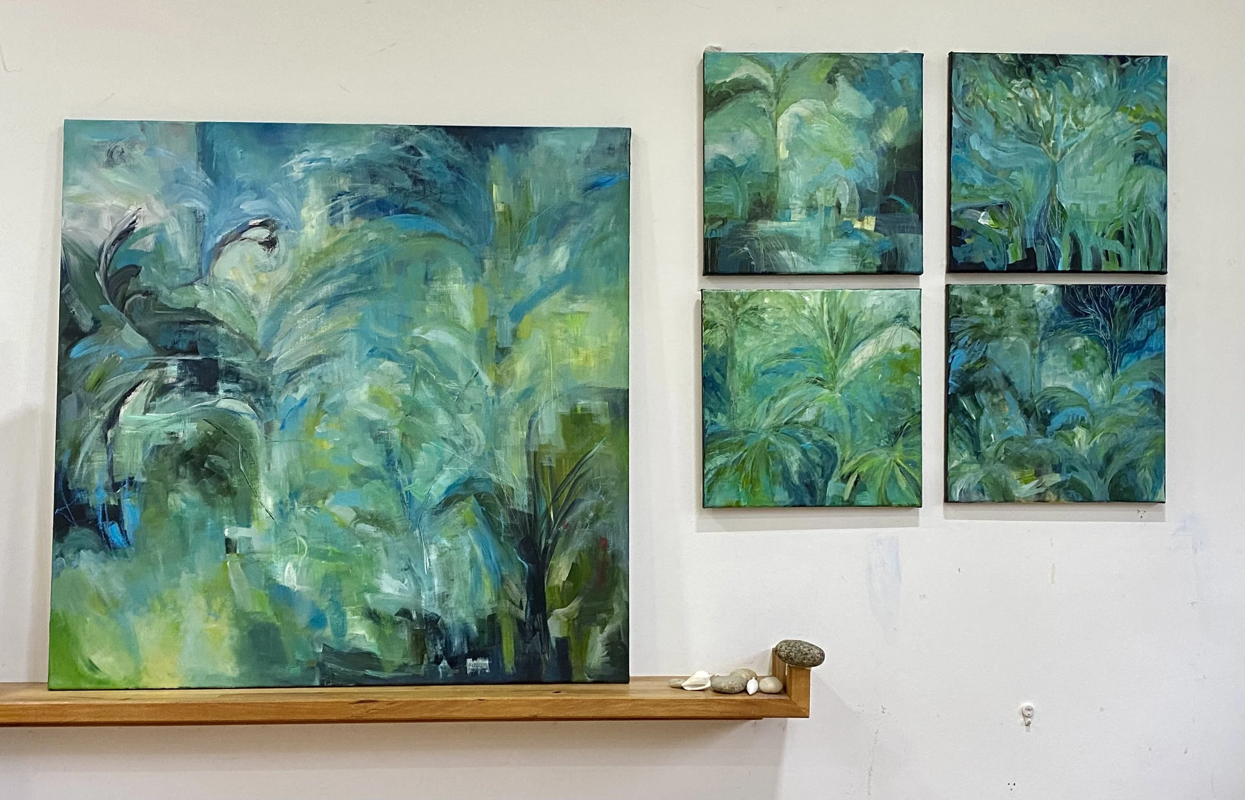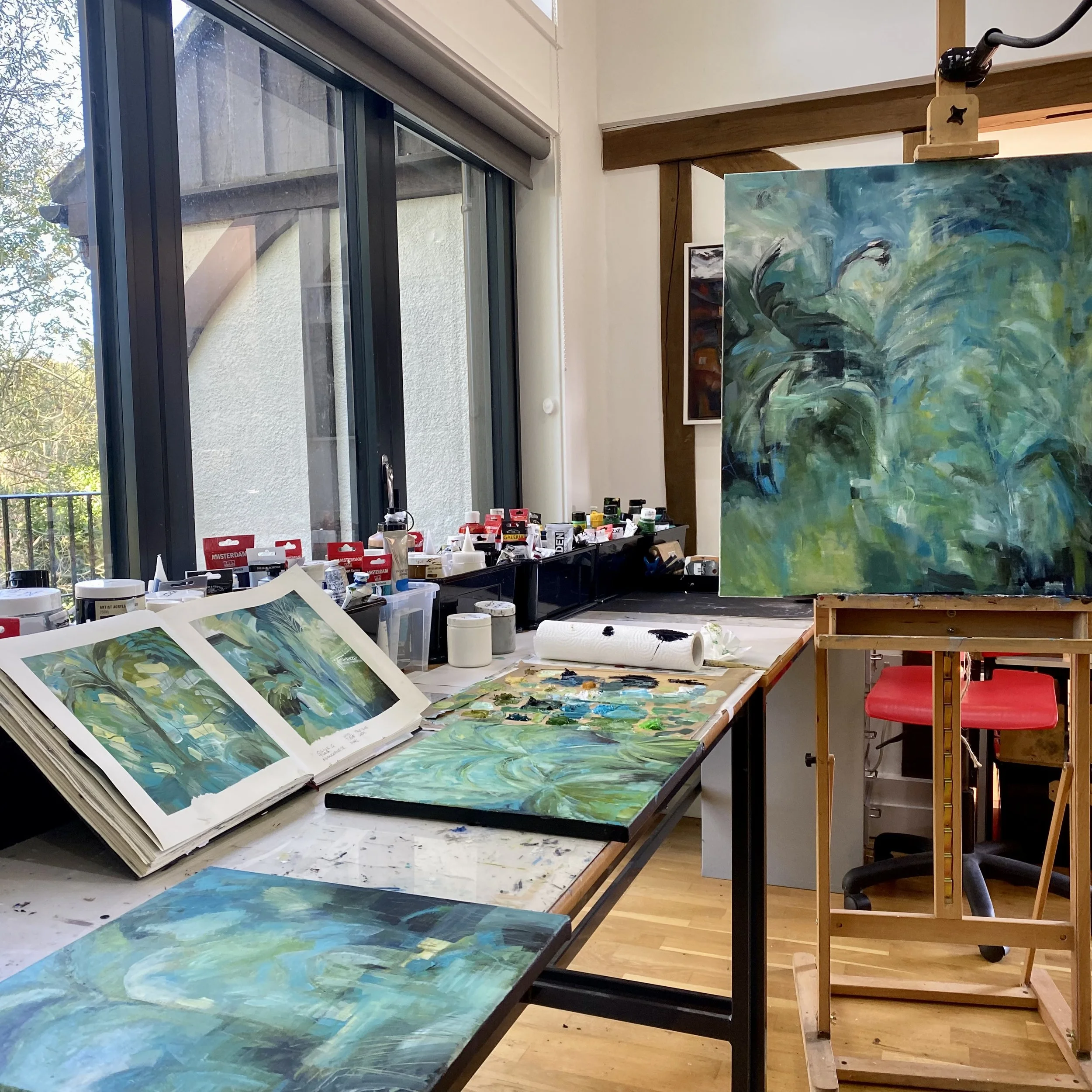 Here I was just using a few key colours in acrylic with tons of mixes:- Olive Green, Sap Green, Turquoise, a Manganese blue, Mars black, a translucent mixing white and some unbleached Titanium (Titanium Buff). I try to record colours I’ve used as I go, and sometimes specific colour mixes, so I can remix if needed, especially as they can become the core colours for a collection, and I really don’t want to forget how I made the colours! I always swatch too, and can’t recommend keeping swatches highly enough! I deliberately worked straight into acrylic paint, with no base drawing to keep the freshness. The shots below show studio set up and work in progress on three 30cm canvases in this collection 🔽