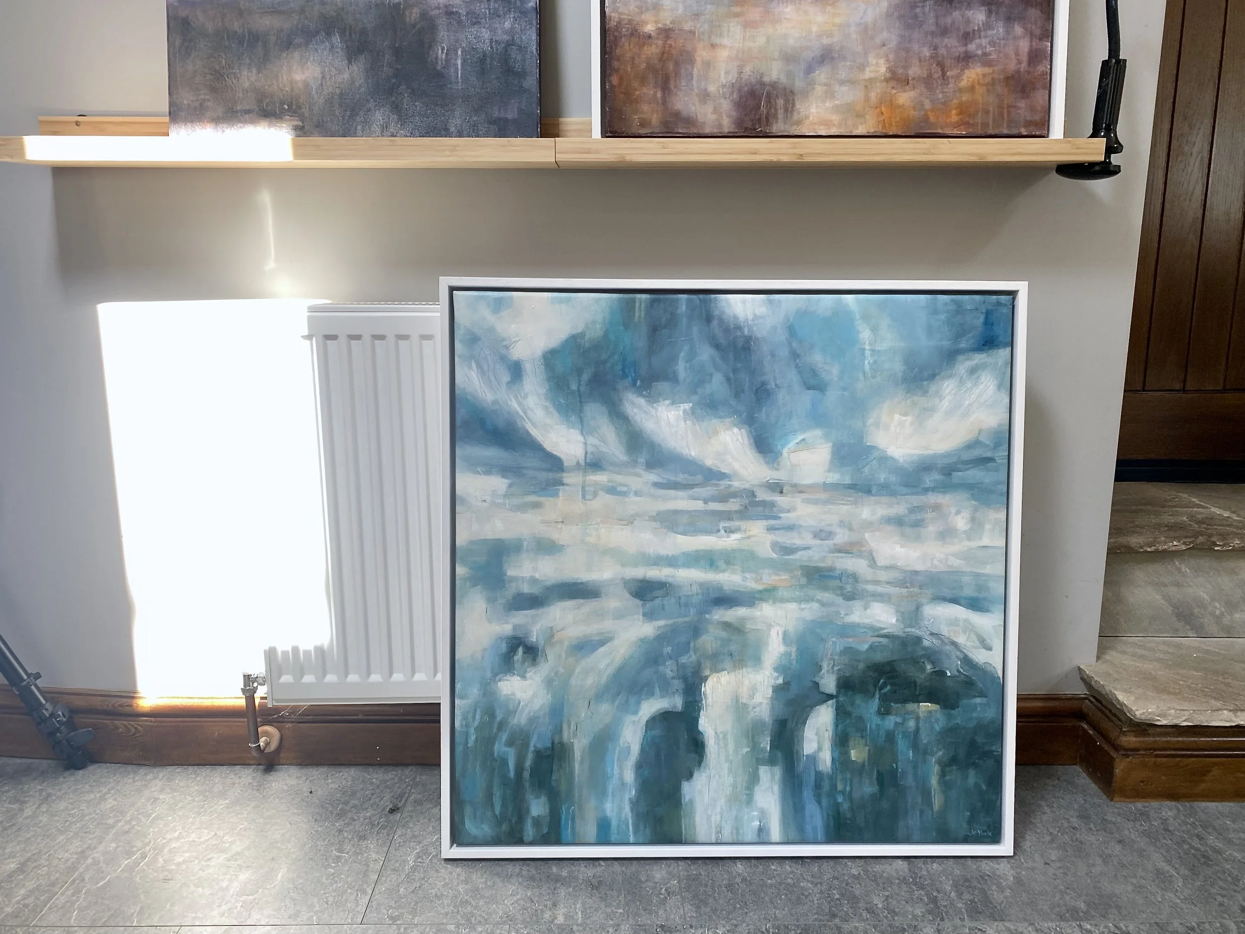 This painting is just over 76cm x 76cm, on a particularly lovely heavy quality canvas, and now framed in a bespoke hand painted tray frame. We All Need An Ocean, is painted in many layers of acrylic paint, with overlaid colours and some very subtle drawn details. It’s available now, so do hit the button below if you would like to know more!