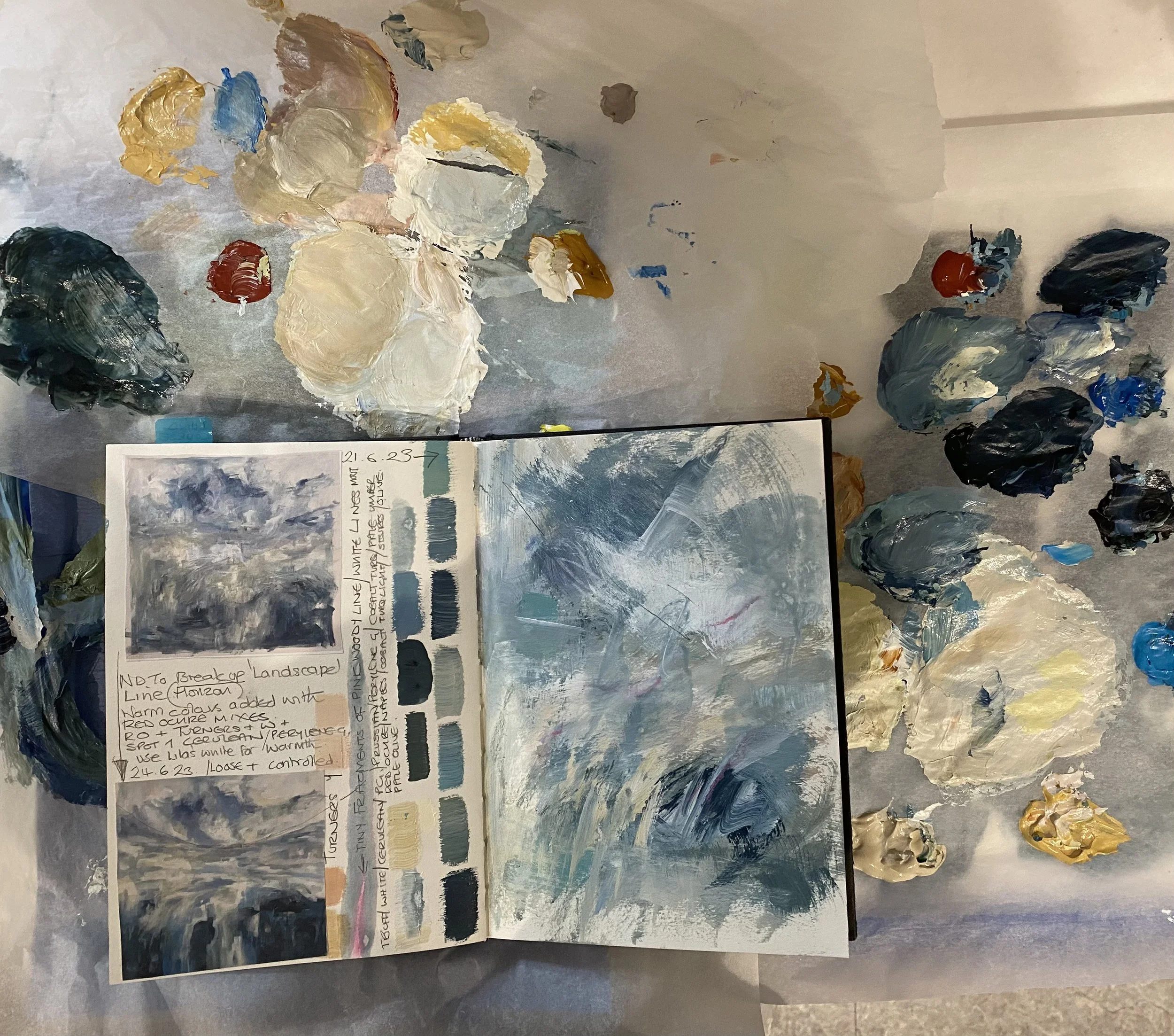 I’ve been busy in the studio, finishing off some work and starting some new…the studio journal page above is for one of the pieces I’ve recently finished. It’s called, (a little enigmatically I admit), We All Need An Ocean, and it comes from the experience of walking deserted beaches up in Dumfries and Galloway, in Southern Scotland. There is such a tangible sense of space and air; exhilarating and calming at the same time- if that makes any sense at all? Anyway, for me open space is something that really fires my imagination and triggers ideas for work.