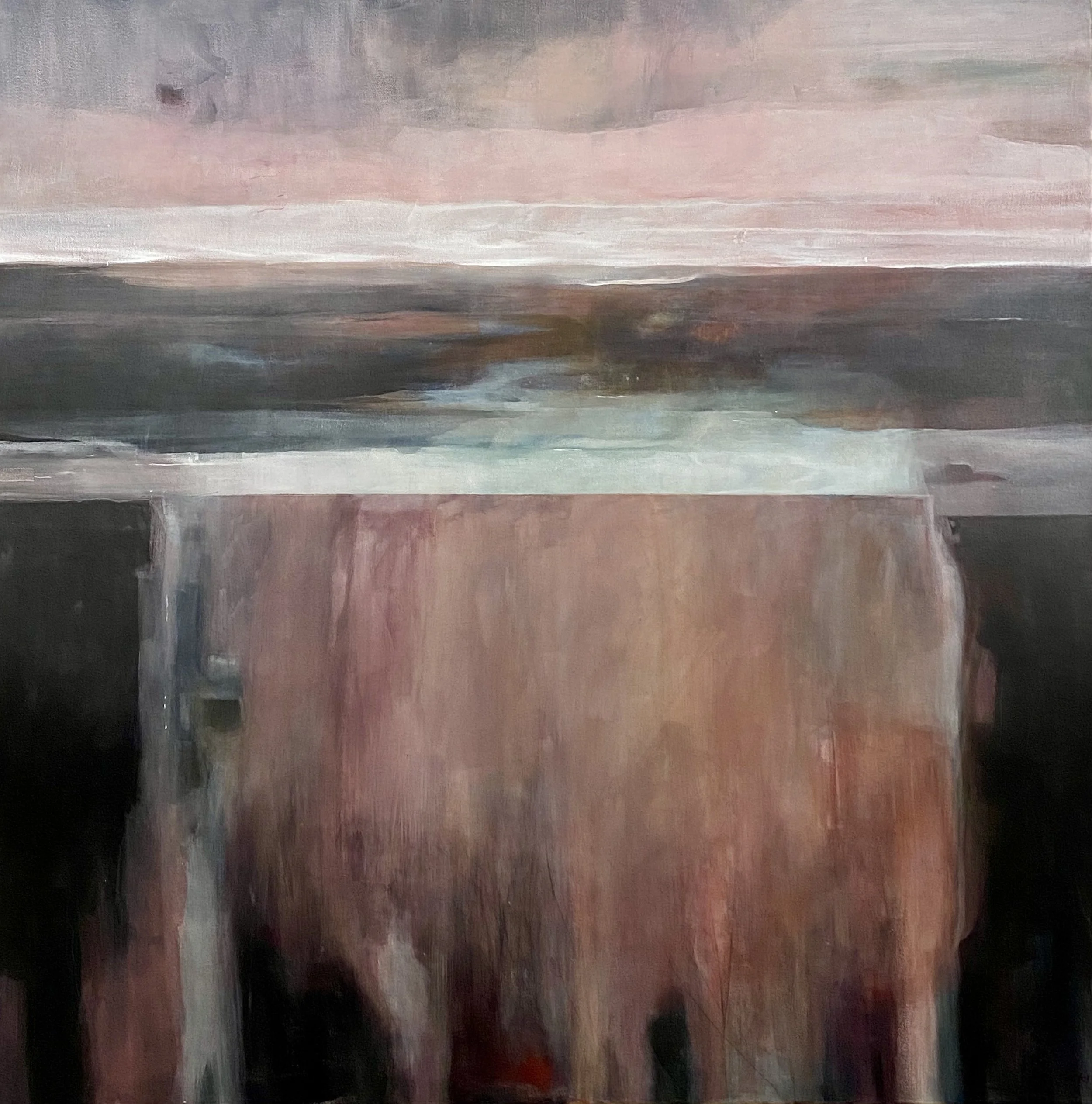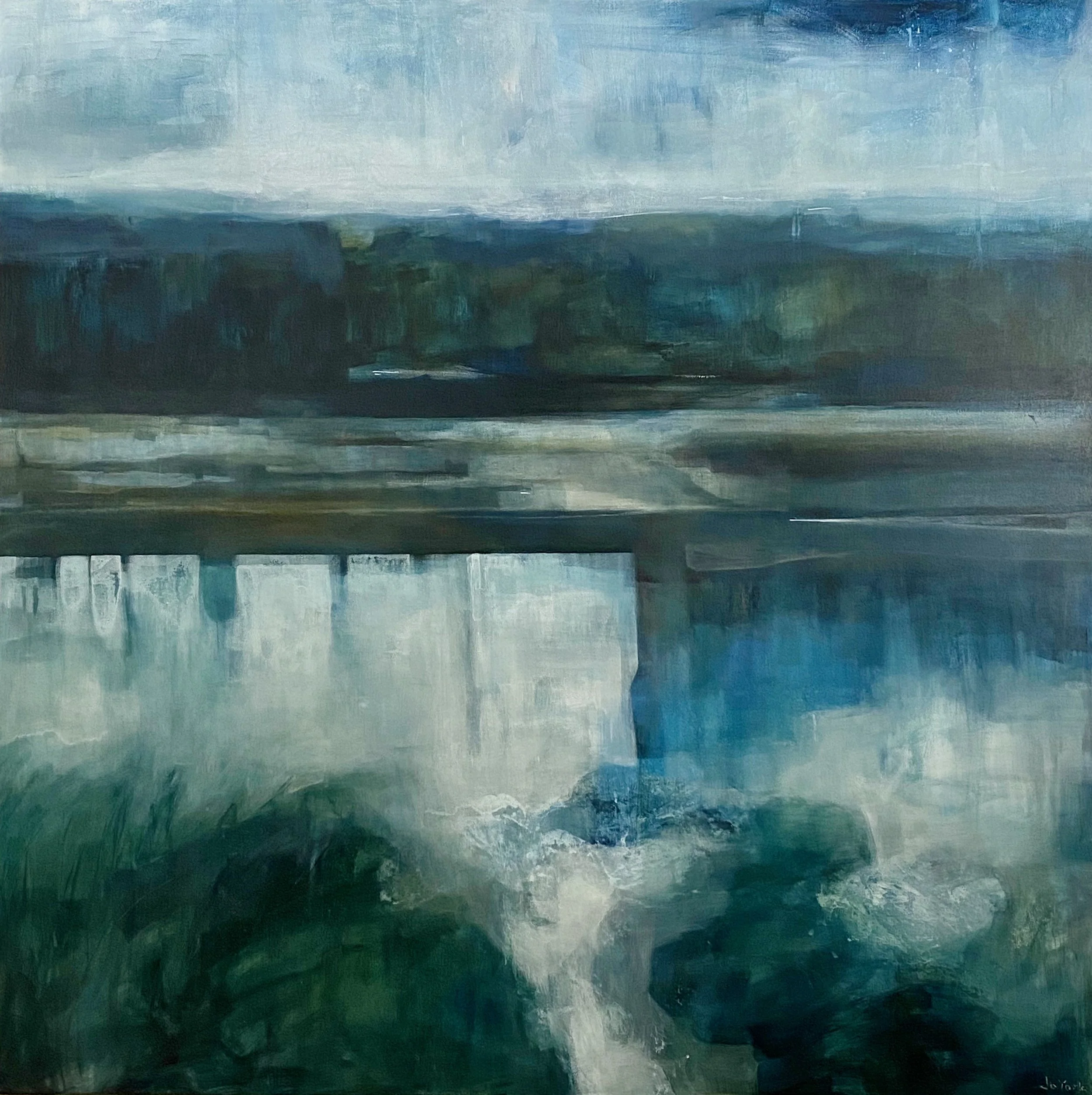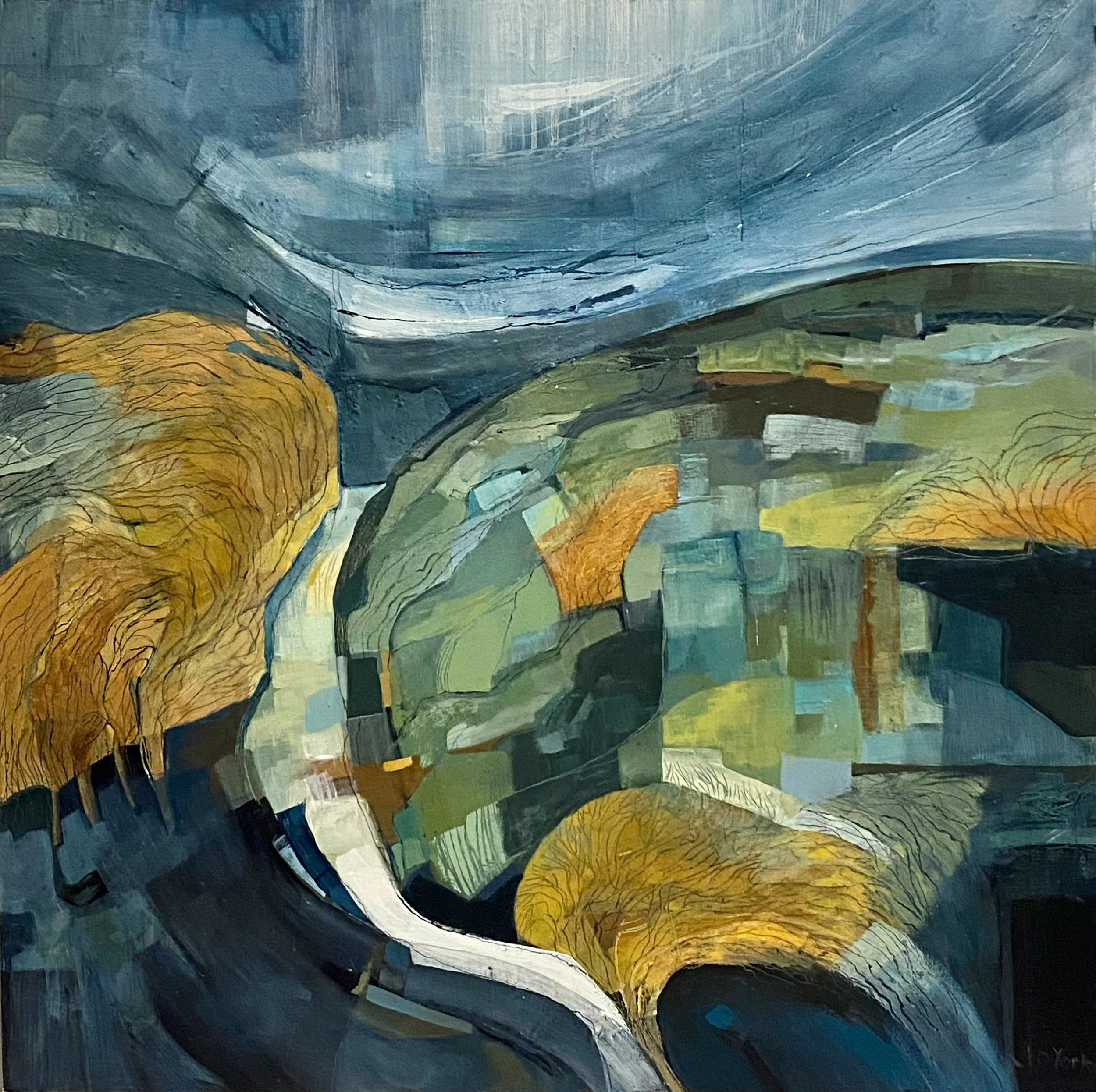 The second one I’ve had on the go (shown below), does relate to the first and also to a painting I sold last year, called Hidden Pool. I often like, no in fact I normally like to work on at least a couple of pieces at once. This is not necessarily easy in my very small studio space, so it does require some shifting and juggling…I find I can just get two 1 metre square canvases on my painting wall, so long as I let them spill over on either end! I really like the feeling of having a couple of pieces on the go; I like the way they can relate to each other and working on one, can spark an idea for the other. Effectively they talk to each other, and I find it very helpful-especially when you get a bit stuck; not quite knowing what move to make next, it makes such good sense to move over to the other, and then the answer usually comes clear. There are also all the practical things, like letting an area dry while you get on happily with something else.
